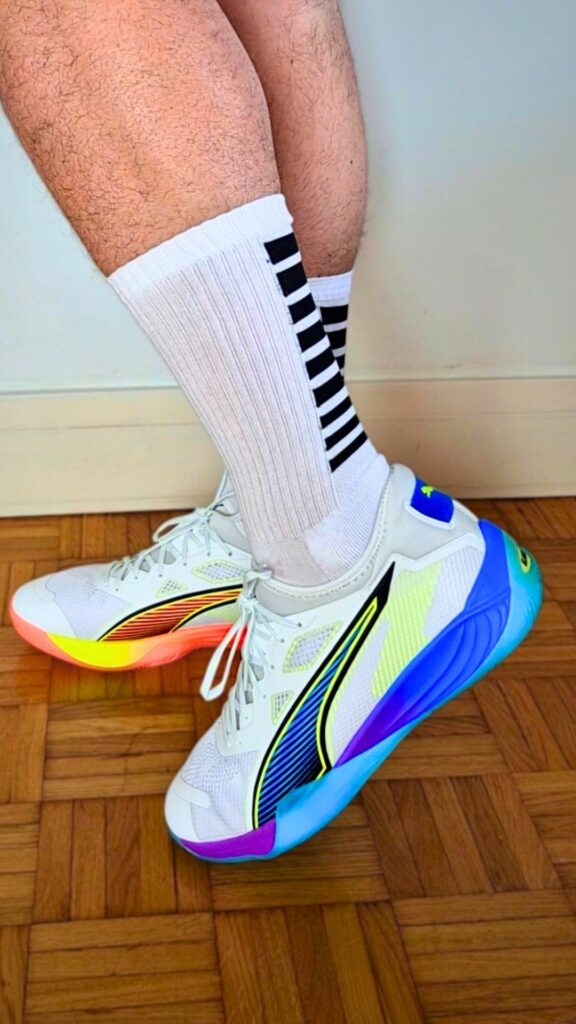 J’ai reçu la Puma Eliminate NITRO™ SQD 4 Game On de la part de Handball-Store quelques jours après sa sortie. La paire arrive dans sa fameuse boîte à chaussures rouge Puma. La première impression est flatteuse : son design bicolore donne un réel caractère à la paire et se différencie des autres produits.